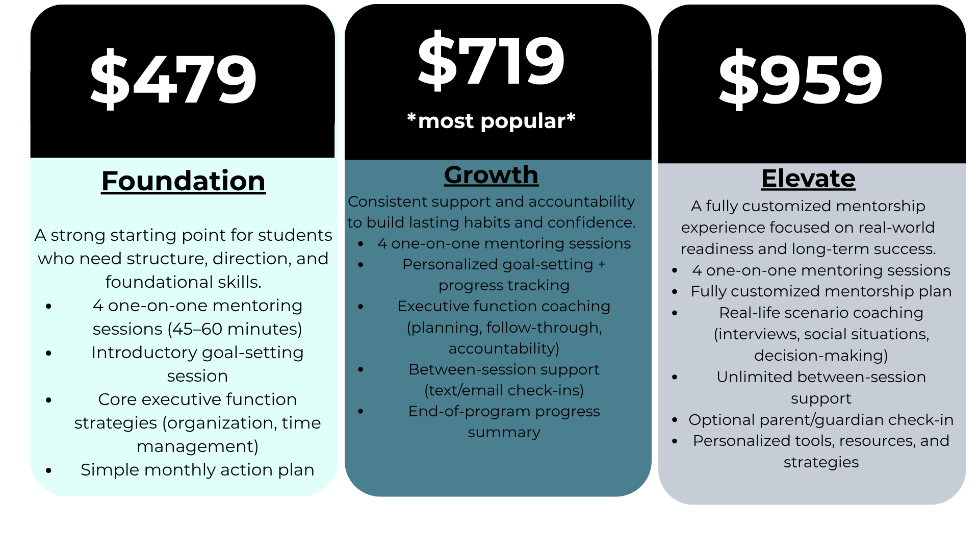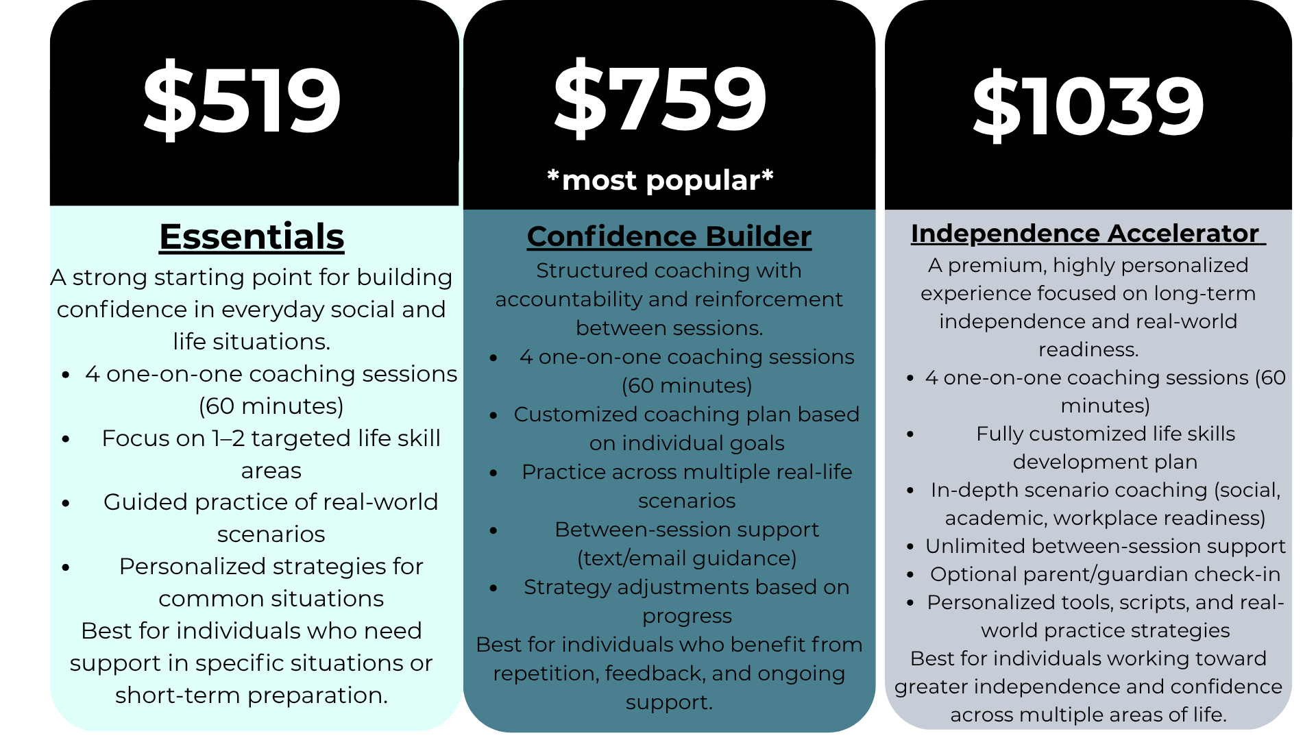 At Truevale, we go beyond traditional support—equipping individuals with the practical skills and confidence needed to navigate real-world challenges successfully. Our tiered packages are designed to meet you where you are, with varying levels of guidance, structure, and ongoing support. Our services are offered virtually except for residents of the DFW area. Message us at contact@truevalementor.com to get more details about our in-person service area.
